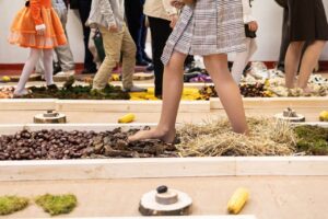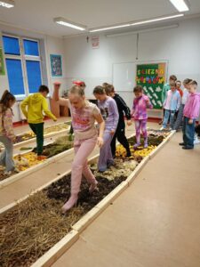 Jedna z klas zamieniła się w naturalny plac usłany kłującymi szyszkami, mięciutkim mchem, puchatą owczą wełną. Było odważnie, bo każdy chętny mógł zrzucić buty i przespacerować się po ścieżce boso.
